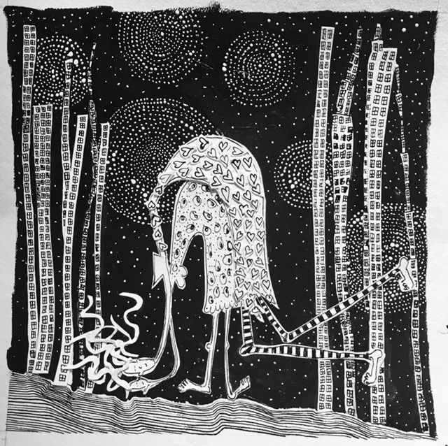 Currently I am working on a new series of drawings and paintings on canvas and paper. My work contains whimsical pen and ink drawings that focus on these fanciful creatures in a city-like landscape that are rich in color, full of creative patterns and bizarre movements. My recent series is focused on abstracted human figures that float and dance about on the surface of the canvas.